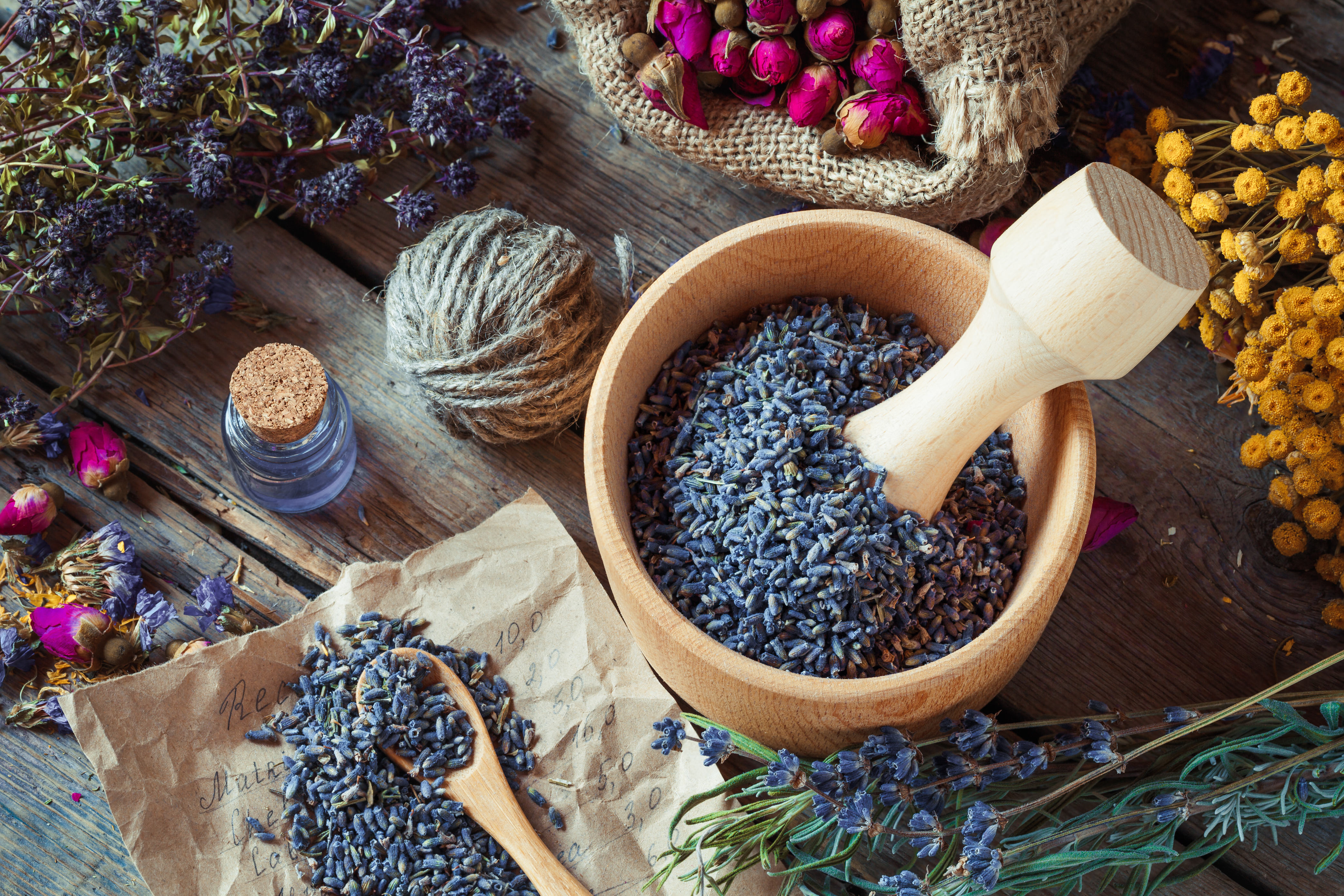 Healing herbs, wooden mortar with lavender, bottles of tincture,